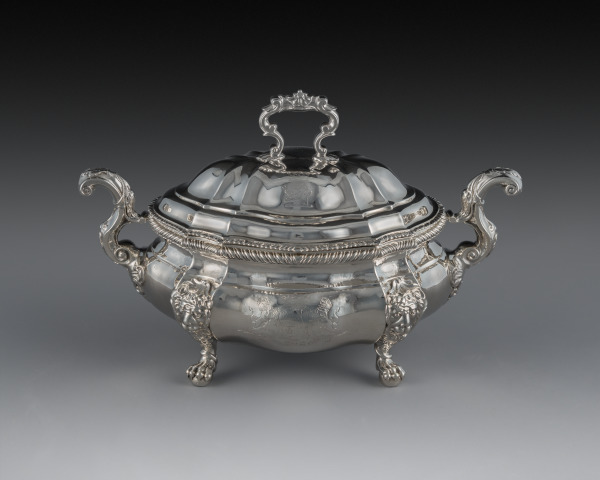 Dinner services in silver and silver-gilt came into fashion early in the 18th century and were highly prized by Europe's rulers and aristocracy. Because of their scale and virtually limitless potential for ornamentation, tureens were the principal elements of the elegant dinner service and occupied prominent positions on the table, surrounded by other serving dishes and platters. These tureens were commissioned by two members of the Lamb family. Sir Matthew Lamb (1705–1768), ordered one of the large tureens in 1739 from George Wickes, a prominent London silversmith. Matthew was succeeded by his son, Peniston Lamb (1748–1828), 1st Viscount Melbourne in the Peerage of Ireland, who commissioned the other tureens—one in 1768, the other in 1774—from John Parker and Edward Wakelin. Parker and Wakelin had worked for Wickes and took over his business when Wickes retired in 1760. Note the finely engraved Lamb armorials on the tureens.