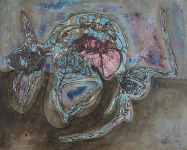 "I found a wonderful phrase . . . which I think states the nature of my painting in a most exact way: “The Structure of Becoming.” . . . My paintings are always concerned with the most minute relationships and structure, yet always remain in flux, in a state of becoming, never (in spite of the intensity and detail) to arrive at a final recognizable form." -Charles Seliger, 1980 Charles Seliger was one of the youngest, most perceptive, and most talented artists working in the stimulating environment of the New York art world in the 1940s. By his late teenage years, he had acquired a strong working knowledge of early twentieth century modernism but was particularly fascinated by Surrealism, which he encountered in books and at the galleries of Pierre Matisse, Julien Levy, and Peggy Guggenheim (who had given him his first solo exhibition, at age 19, in 1945). The fantastic imagery, inventive processes, and creative freedom that characterized Surrealism inspired Seliger to develop his own mature style between 1942 and 1950. "Metamorphosis" is an excellent example of the artist’s work from this era. It features a spiraling biomorphic form which appears to be in a state of flux, partially buried under the ground, partly emerging into the atmosphere above. The painting exemplifies Seliger’s signature blend of automatism and technical sensitivity.