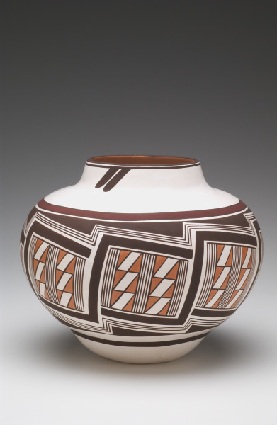 Self-taught artist Gladys Pacquin insists on traditional, open firings rather than a kiln. She believes the kiln dries out the vessel and makes it look dead. Pacquin incorporates ancient designs but does not copy them, stating that she is simply carrying on the earlier artist’s inspiration.