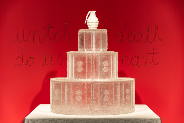 In this sculptural installation, Silvia Levenson addresses the contrast between the romantic ideal of marriage and the reality of domestic violence that threatens many women. A translucent, hollow glass cake, decorated with delicate scrollwork, is topped by a plaster hand grenade—a metaphor for the fragility of relationships and the fear that one’s partner could explode at the slightest provocation. As Levenson states, “The family is often equated with sanctuary…But the evidence shows that it is also a place that imperils lives…One third of murdered women in the world are killed by husband or partner.” Born in Buenos Aires, Argentina, Levenson emigrated to Italy in 1981 with her husband and young children to escape the oppressive regime of military dictator Jorge Rafaél Videla (ruled 1976–1981), during which members of her family “disappeared.” Her experiences during this intense and frightening time continue to inform her work. Today she divides her time between Buenos Aires and Lesa, Italy