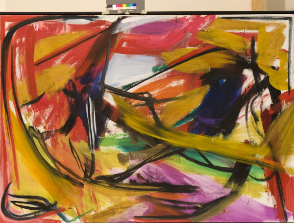 "When I start, I don’t know what’s going to happen…. When you’re dancing, you don’t stop to think: now I’ll take a step…. you allow it to flow." -Elaine de Kooning Over the course of her career, de Kooning alternated between painting expressionistic portraits and more pure abstractions. "Farol" is a stunning example of the latter and is arguably one of the most successful abstract canvases in her oeuvre. It is part of a series of paintings on the theme of the bullfight, which de Kooning undertook after a trip to New Mexico in 1957. In bullfighting, the matador executes a farol by swirling his cape back and over his head to entice the bull to charge. Rather than depicting the massive form of the bull itself, de Kooning eloquently captures the energy, color, and motion of the performance. Although Elaine de Kooning was a member of the first generation of Abstract Expressionist painters, she has only recently gained renewed appreciation and attention through such exhibitions as “Women of Abstract Expressionism,” in which her work was prominently featured. During her lifetime, de Kooning and her art were often overshadowed by her husband, Willem, who was also her teacher. Yet, writing about her paintings, the movement’s leading critic Clement Greenberg noted that “while they relate to Willem’s, they nonetheless transcend that influence and succeed on their own terms.”