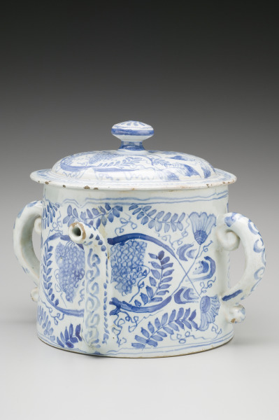 This vessel was used for drinking posset, a beverage of hot milk mixed with wine or ale. As the milk curdled, the curd rose to the top of the pot, and the consumer could suck up the liquor underneath from the pot’s spout. Posset was used both for medicinal purposes and on festive occasions, and additional ingredients could include sugar, spices, eggs, and bread.