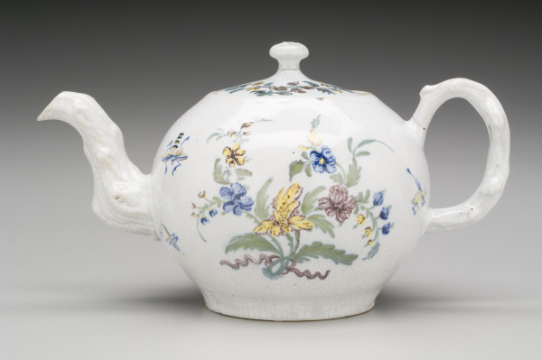 This teapot is one of only sixty or so examples of tin-glazed stoneware, not earthenware. The objects, made in Liverpool from about 1756 to 1764, are mostly tea and table wares. Their function may explain why they were fired to the higher stoneware temperatures, as a stoneware body is stronger than earthenware and thus better able to hold hot liquids.