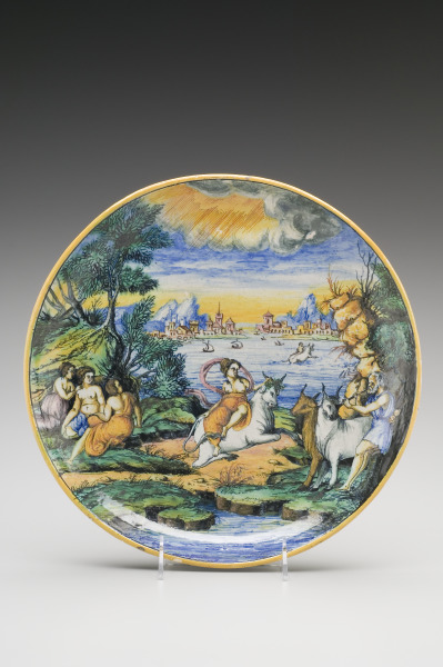In the early 1500s, maiolica artists began painting narrative subjects on dishes, jugs, and other forms. Known as istoriato (“story painting”), this new style drew particularly from classical mythology for its decorative themes. On this dish is the Rape of Europa, a story from Ovid’s Metamorphoses in which Zeus disguises himself as a bull to abduct the princess Europa.