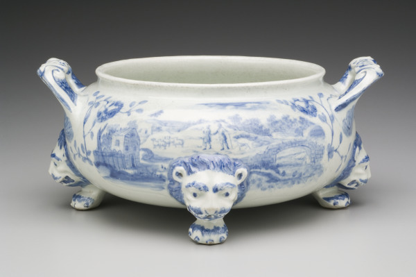 This tureen is a rare form for the Limehouse factory; the pastoral landscapes painted on its sides are rendered in exceptionally fine detail.