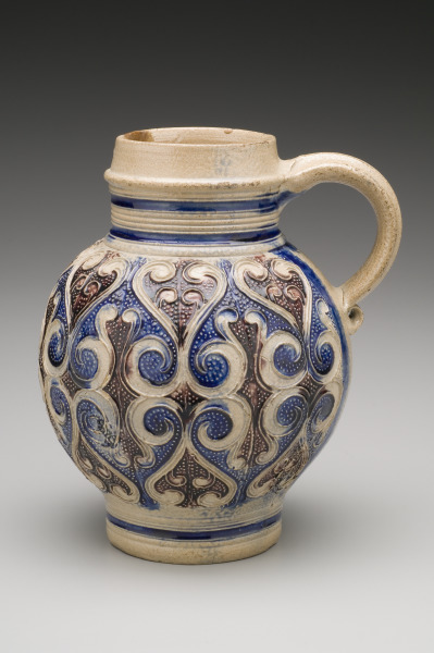 Probably made at Grenzhausen, this jug is decorated in the champlevé style, with cobalt and manganese, two common colorants used by these German potters. The small loop at the end of the handle could be threaded with a cord for hanging.