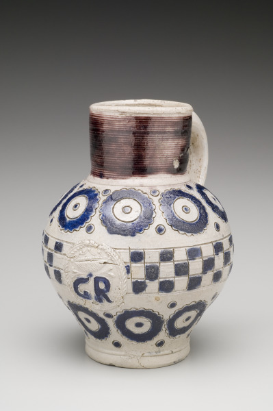 Tankards and jugs of the pint and quart sizes were stamped with a crowned WR (William III Rex) to indicate that they were government standards of capacity. That tradition continued until 1792. Occasionally an AR (Anna Regina) or GR (Georgius Rex) were used.
