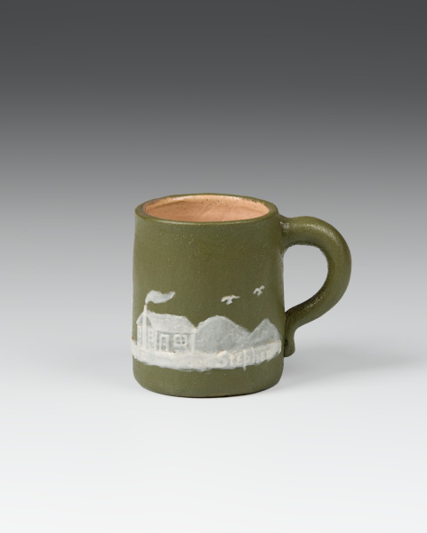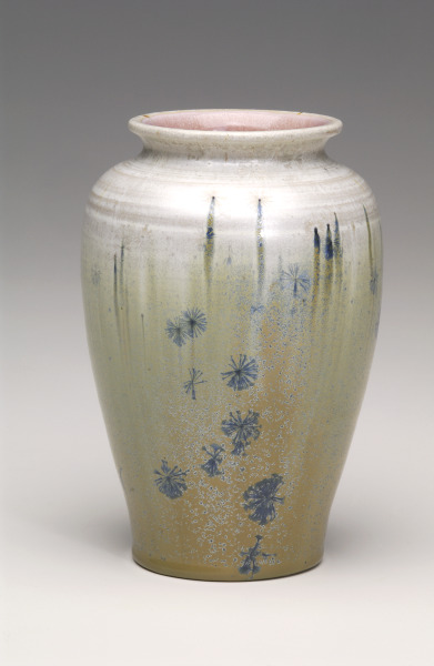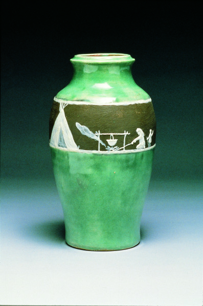 Walter Benjamin Stephen founded Pisgah Forest Pottery in Arden, North Carolina in 1926 and ran it until his death in 1961. he is most famous for his cameo wares. These are vessels, such as the two on vie where, that have been decorated with the pate-surpate technique in which a thin white slip (liquid clay) is applied in successive layers to a colored background to create a slightly raised design. The design is then carved to give further definition.