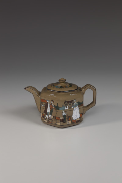 "Deldare" refers to the olive green color of the body of this ware, not to the style of decoration. Each piece of Deldare was hand-decorated over a transfer print. Colors were carefully controlled and the only latitude the decorators had was in the application of the cloud patterns.