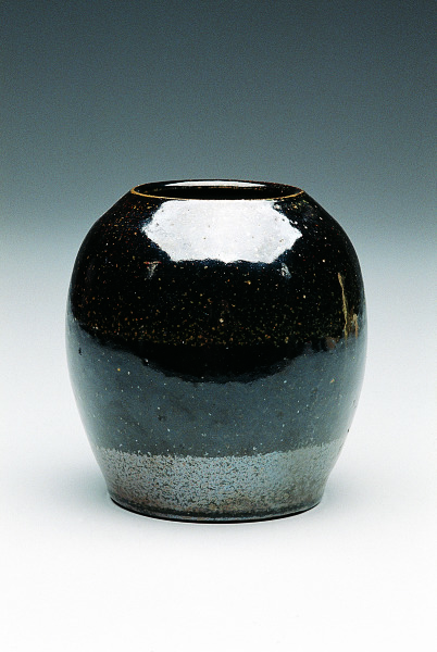 This vase was dipped in the glaze twice, once while holding the item by the top, then by the bottom. The two dips overlap, creating a darker band where the glaze is double in thickness. Bachelder often used this technique in his work.
