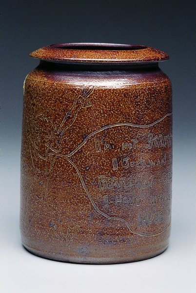 Through the ages, potters have sometimes been compelled to use their vessels to convey politically inspired, often satirical messages. On the canister is an image of a naked Richard Nixon, thirty-seventh President of the United States, serving from 1969 to 1974. He is uttering: “I am not streaking/ I Just Want to Make it/Perfectly Clear/I Have Nothing to Hide.”