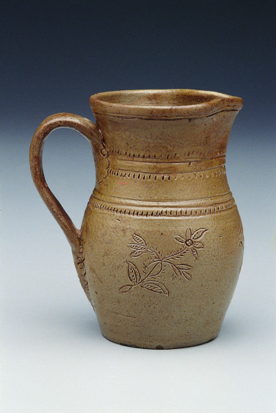 The Webster family had its roots in New England. When Chester Webster moved to North Carolina in 1828, he probably first worked as a potter for his brother Edward in Fayetteville before moving to Randolph County. Webster’s pots are often distinguished by their precisely executed incised decoration, as manifested by the flower and other ornamentation on this pitcher.