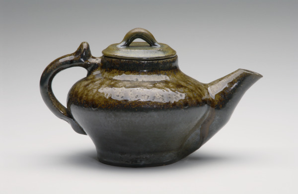 Juliana Busbee, the founder of Jugtown Pottery, purchased this teapot and the other objects in this case during her visit to Bachelder's pottery in 1916. It was during that year that she wrote: "I would rather have my Bachelder teapot, that is a warm brown with soft green glints all over it, than the most elegant one that could be bought".